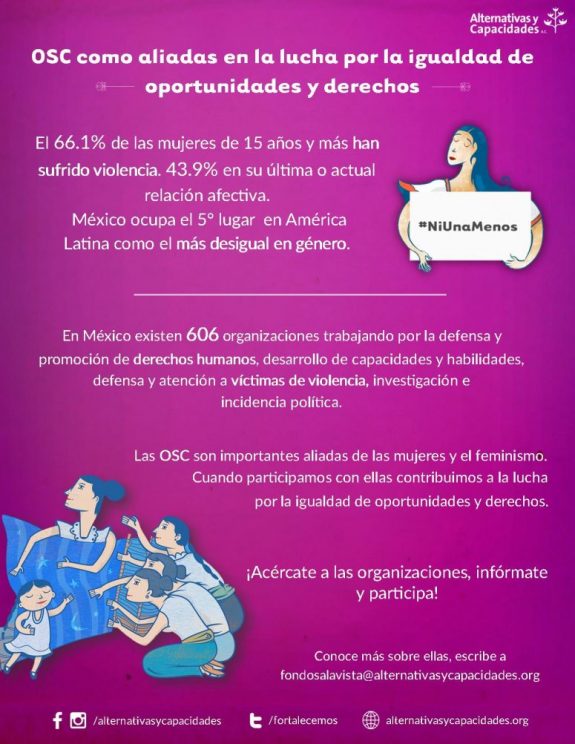 En Alternativas creemos que es fundamental visibilizar el trabajo y los logros hasta ahora obtenidos por las OSC, tanto a nivel nacional como en los diferentes contextos locales, con un constante apoyo de la ciudadanía, empresas, gobierno y donantes. En un día como hoy, es crucial recordar que el desarrollo social y económico del país depende de la correcta inclusión de mujeres en los diferentes ámbitos de la sociedad. Las OSC son importantes aliadas para el progreso de las mujeres y el feminismo, y en la medida en la que participemos activamente con ellas estaremos un paso más cerca de las metas en esta lucha por la igualdad de derechos y oportunidades entre mujeres y hombres.