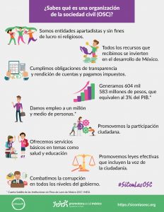 La sociedad civil organizada está conformada por diferentes grupos de personas preocupadas por la situación nacional, que al mismo tiempo están deseosas de contribuir a la solución de los problemas sociales que nos afectan desde nuestros barrios, comunidades, ciudades y entornos. Uno de estos grupos somos las organizaciones de la sociedad civil (OSC), que no buscamos fines de lucro; lo cual significa que no generamos reparto de utilidades y todos los recursos que recibimos se invierten directamente en generar cambios de impacto. No tenemos afiliación a ningún partido político y no discriminamos en el apoyo que brindamos a la comunidad por ningún motivo.